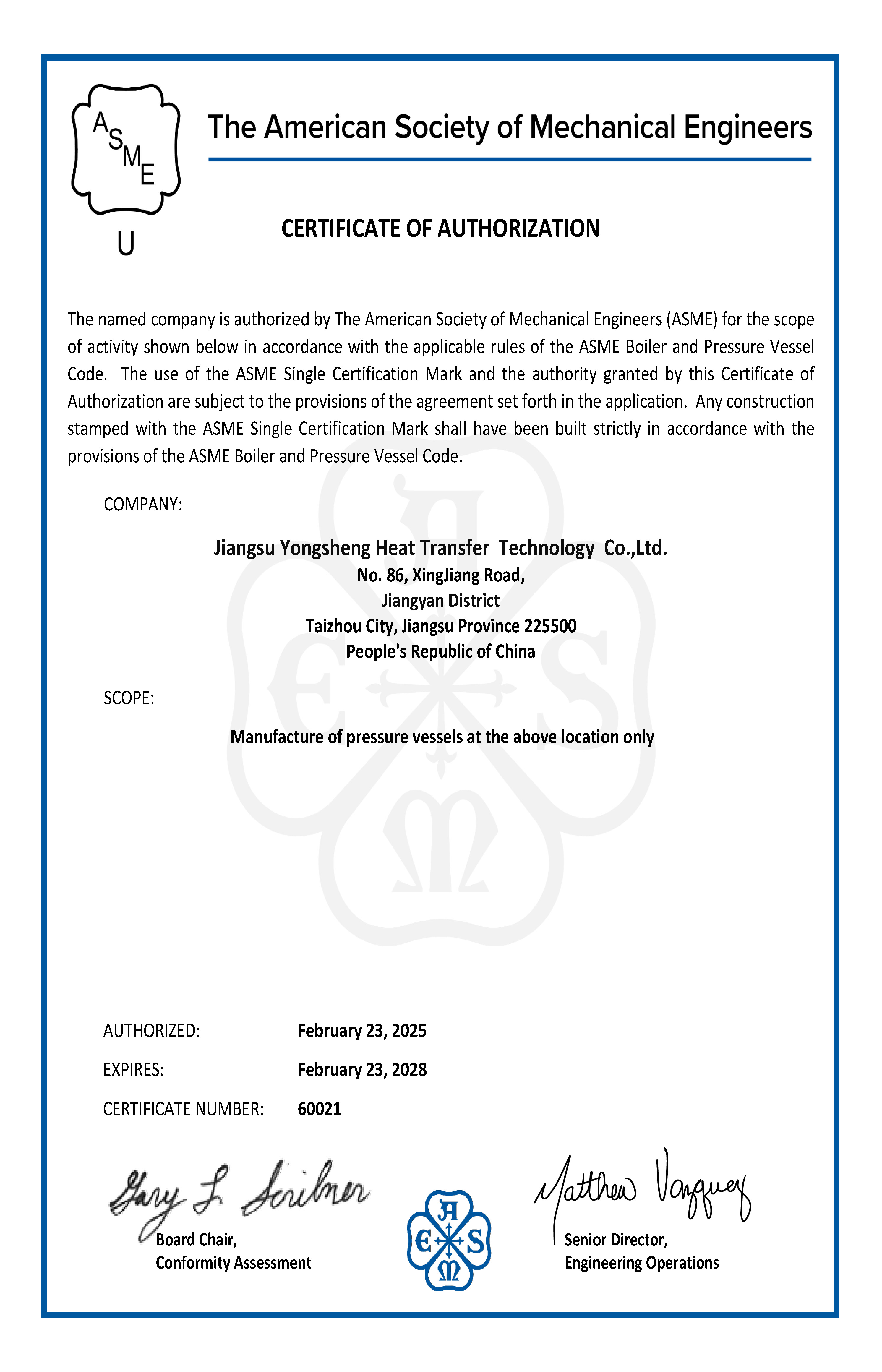 江苏永盛传热科技有限公司(Jiangsu Yongsheng Heat Transfer Technology Co., Ltd.)成立于2001年,是一家专注于热能传递解决方案的高新技术企业。公司专业从事各类管壳式换热器、压缩机级间冷却器、空气冷却器、电加热器等产品的研发、设计与制造。
